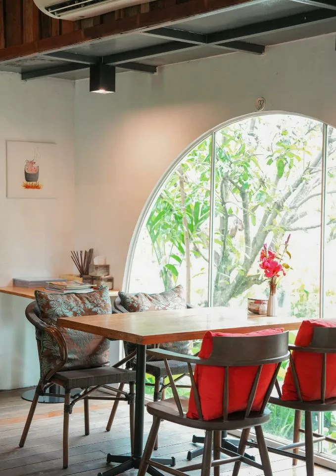 คาเฟ่ The Three Little Pigs สำหรับร้านนี้เราชอบความเงียบสงบของร้านมาก คาแรคเตอร์ของร้านเป็นคาเฟ่กลางสวนแบบนั่งลงไปในท้องร่องของสวนเลย มองเห็นวิวทิวทัศน์ต้นมะพร้าวไกลสุดลูกหูลูกตาได้เลย การตกแต่งร้านเป็นในสไตล์คาเฟ่กลางสวนแบบที่เราเห็นได้ทั่วไป อาคารหลักจะเป็นเรือนกระจกห้องแอร์ แต่ว่าจุดเด่นไมได้อยู่ในนั้นเลย แต่เป็นจุดที่ให้นั่งด้านนอกมากกว่า รอบอาคารจะมีจุดให้เรานั่งมอง ชิมเบเกอรี่ ดื่มกาแฟพร้อมกับนั่งมองธรรมชาติตามท้องร่องของสวนอย่างเป็นธรรมชาติ แต่จุดที่ชอบจริง น่าจะเป็นการจัดท่าน้ำลงไปท้องร่องให้เราลงไปนั่งดื่มกิน ได้อย่างเป็นธรรมชาติมาก แถมท่าน้ำที่ยื่นลงไปจะเป็นใต้ต้นไม้ใหญ่ด้วย ทำให้เกิดบรรยากาศที่ร่มรื่นด้วย แต่ที่เราชอบสุดน่าจะเป็นบรรยากาศที่ค่อนข้างเงียบมาก ไม่พลุกพล่านเลยใครที่อยากหาที่นั่งอ่านหนังสือ หรือ ที่นั่งคุยกันเงียบๆ ร้านนี้ตอบโจทย์ ส่วนสายถ่ายภาพน่าจะถูกใจ เพราะเค้ามีการจัดมุมถ่ายภาพไว้ตลอดทาง รวมถึงมีการวางพร็อพประกอบฉากให้เราได้นำไปถ่ายได้เลย โดยเฉพาะมุมคลาสสิคที่ประดับด้วยรถเก่าอย่าได้พลาดเด็ดขาด