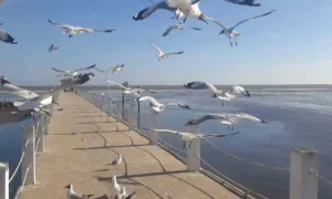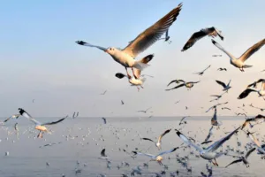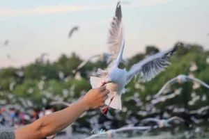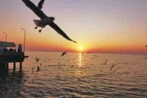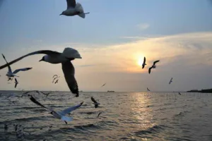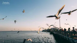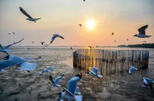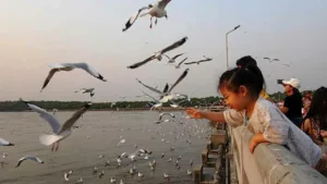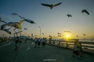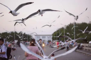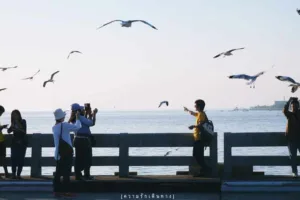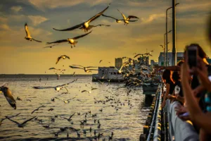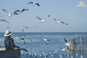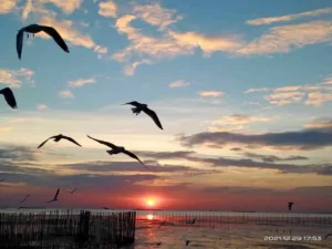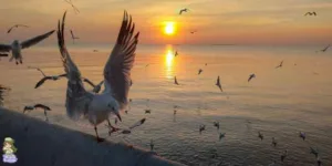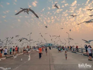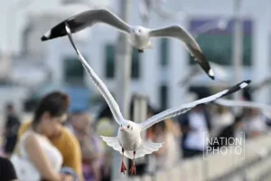 ทีนี้มาถึงไฮไลต์ของงานนี้ ก็คือ นกนางนวล เราไปอากาศร้อนก็จริง แต่นกนางนวล ก็ไม่ยอมแพ้ บินมารับแขกอย่างเราตลอดเวลา โดยเฉพาะกิจกรรม การให้อาหารนกนางนวล ที่เราไปยืนริมสะพาน จากนั้นก็ยื่นมือพร้อมกับเอาอาหารไว้ในมือ นกนางนวลจะมาโฉบไป เป็นอีกหนึ่งความตื่นเต้นที่สนุกดี แต่แอบเจ็บนิดหนึ่งตอนมันบินมาจิกอาหาร หรือใครกลัวเจ็บ ก็โยนขึ้นบนฟ้าก็ได้ เดี๋ยวนกนางนวล จัดการให้เอง (แต่ควรโยน นอกสะพานนะ) เจ้าหน้าที่บอกว่า ถ้าไม่อยากพลาดนกนางนวล ควรไปเที่ยวช่วงเดือน ตุลาคม ถึงกุมภาพันธ์ ถ้ามาหลังจากนั้นจะไม่เจอ เพราะมันบินอพยพหนีไปหมดแล้ว เดินเที่ยวตั้งแต่บ่ายจนเย็น ก็ถึงเวลากลับแล้ว แต่ก่อนหลับเราชอบบรรยากาศดวงอาทิตย์สีส้มกำลังจะลาลับขอบฟ้าไป พร้อมกับฉาบสีแดงไปทั้งท้องฟ้า แบบมีนกนางนวลบินผ่านไปมา นี่เป็นวิวสวยงามที่เราไม่ควรพลาดเลยเช่นกัน