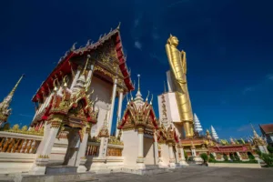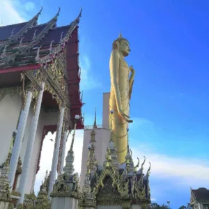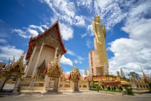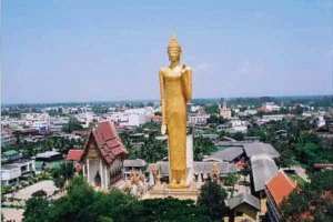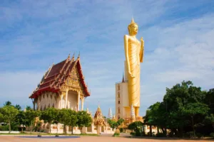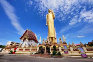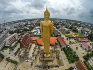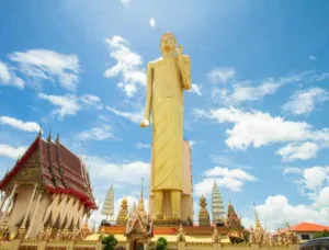 เราขับรถมาตามเส้นทางใน เมืองร้อยเอ็ด มาทางเส้นบึงพลาญชัย หลังจากเดินทางที่นั่นแล้วก็มาต่อที่นี่เลย ขับรถแป๊บเดียว สัก 10 นาที ก็ถึงแล้ว เรามองเห็นพระหลวงพ่อใหญ่มาแต่ไกลทีเดียว เป็นภาพที่น่าเลื่อมใสมาก จนมาถึงตัววัด มีสถานที่จอดรถมากมาย ห้องน้ำห้องท่าก็สะดวก สะอาด ถือว่าดีเลย พอได้มาก็รีบไปสักการะหลวงพ่อใหญ่ทันที พอได้มาสักการะ มาเห็นท่านแบบใกล้ๆ เราต้องยอมรับว่าเราอึ้งกับแรงศรัทธาพี่น้องชาวร้อยเอ็ดจริงๆ เพราะการจะสร้างพระพุทธรูปองค์ใหญ่แบบนี้ได้ ไม่ใช่เรื่องง่ายเลย ไหนจะเรื่องการดูแลรักษาอีก นับถือใจพี่น้องชาวร้อยเอ็ดจริงๆ เราได้สักการะพร้อมกับเดินดูรอบๆองค์หลวงพ่อใหญ่สักพักรวมถึงได้เข้าไปสักการะพระประธานในโบสถ์ข้างๆ ก็ได้เวลาไปต่อ ภายในวัดบริเวณสวนเค้าจัดให้มีรูปปั้นเกี่ยวกับเหตุการณ์สำคัญในพระพุทธประวัติด้วย อันนี้เราว่าดี อย่างเช่น เหตุการณ์ประสูติ เหตุการณ์ตรัสรู้ เหตุการณ์การแสดงปฐมเทศนาต่อปัจจวัคคีย์ทั้งห้า เหตุการณ์ปรินิพพาน อันนี้ก็ทำได้เหมือน แต่จุดที่เราว่าแปลกดีเป็นพระพุทธรูปปางไสยาสน์ ที่เค้าไปประดิษฐานไว้ในโพรงใต้ต้นไม้ ทำให้เราต้องมุดเข้าไปเพื่อสักการะ เราก็มุดเข้าไป (แต่ว่าโพรงเล็ก ทำให้เข้าได้ทีละหนึ่งคนเท่านั้น) จากนั้นก็เดินต่อรอบวัด ก็มีทั้งศิลปกรรมมากมายทั้งกำแพงวัด ผนัง และทุกอย่าง ถือว่าเป็นอีกหนึ่งวัดที่เราไม่ควรพลาดมา โดยเฉพาะสายวัด สายธรรม