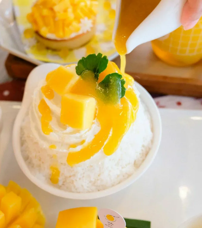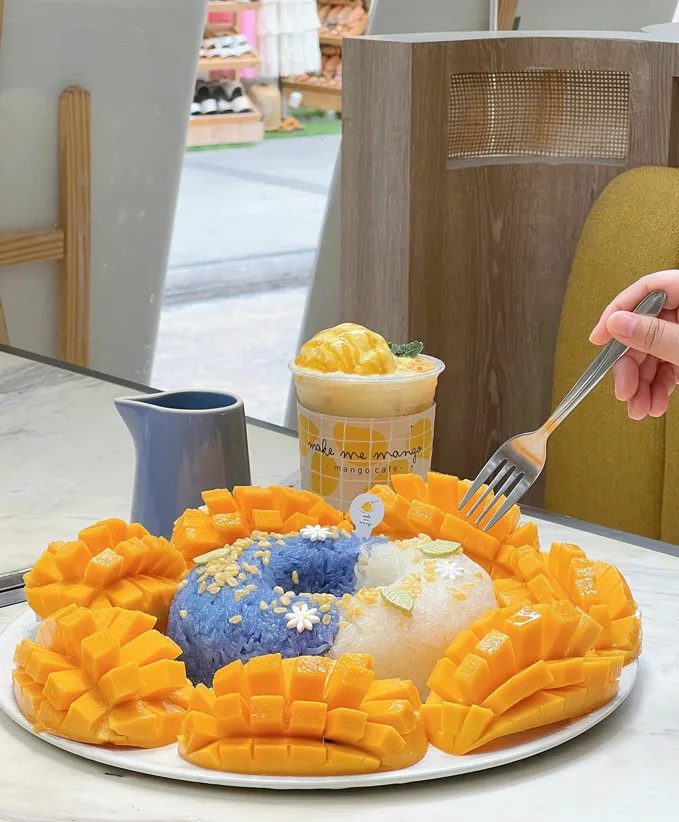 เมก มี แมงโก้ ท่าเตียน ก็จะมีให้เลือกแบบหลากหลาย และเมนูเด็ดที่โดดเด่นสุดๆ จะเป็นเจ้า “มะม่วง” สำหรับตัวมะม่วงนี้ทางร้านจะรังสรรค์เมนูต่างๆ ที่เกี่ยวกับมะม่วงมากมายให้เราได้เลือกชิม เช่น บิงซูมะม่วง น้ำมะม่วงปั่นโยเกิร์ต เป็นต้น และเมนูสุดพิเศษที่เมื่อมาแล้วที่คาเฟ่นี้แล้วไม่ควรพลาดนั่นก็คือ “ข้าวเหนียวมะม่วง” หรือ “Make me mango” ที่จะประกอบไปด้วยข้าวเหนียวมูล พุดดิ้งมะม่วง สังขยา ไอศรีมมะม่วง พร้อมด้วยถั่วทอง น้ำกะทิ ที่บอกได้เลยเมื่อทานเข้าไปแล้วให้ความรู้สึกแบบฟินสุด