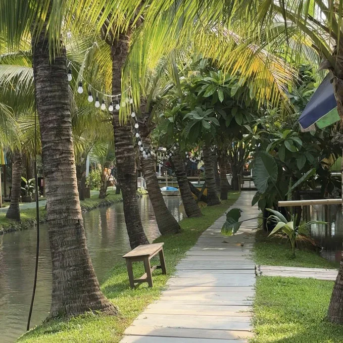 คาเฟ่กลางสวน เป็นนิยามของร้าน คาเฟ่ โอทู คอฟฟี่ แอนด์ บิสโตร ดยร้านนี้เราจะรู้สึกเหมือนกับว่า เราไปนั่งกินข้าว กินกาแฟสวนหลังบ้านของเพื่อน หรือ ไปนั่งพักผ่อนตามสถานที่ต่างๆ นั่งเอง การตกแต่งร้าน ส่วนของอาคารหลักจะเล็กหน่อย โดยจะเป็นอาคารกระจกทั่วไป เข้าไปจะมีเคาท์เตอร์บาร์ เราต้องสั่งอาหาร และจ่ายเงินตรงนี้เลย จากนั้นก็ไปนั่งรอตามจุด ตรงนี้ต้องบอกว่า ใครอยากนั่งห้องแอร์อาจจะผิดหวัง เนื่องจากว่าโต๊ะมีให้นั่งน้อยมาก (ร้านคงอยากให้เรานั่งด้านนอกมากกว่า) ออกมาหน่อยจะมีที่นั่งแบบโอเพ่นแอร์ รอบอาคารดังกล่าว่ แต่ว่าไฮไลต์ของคาเฟ่ที่นี่น่าจะเป็นการนั่งตามท้องร่องในสวน โดยร้านจะทำท่าน้ำยื่นลงไปในท้องร่องใต้ต้นมะพร้าว มีร่มผ้าใบกางให้ด้วย(เพื่อกันแดด และกันมะพร้าวตกใส่หัว) ถือว่าลมเย็นมาก แต่ถ้าหากเรายังรู้สึกร้อน สามารถขอพัดลมเพิ่มได้เพื่อให้สบายตัวมากขึ้น บรรยากาศของร้านที่ได้นั่งกินบนท่าน้ำบนท้องร่องของสวนมันให้ฟิลได้ใกล้ชิดกับธรรมชาติแบบของจริง ใครที่พาเรือก็อาจจะเอาเรือของทางร้านพายไปตามท้องร่องได้ ร่องไม่กว้างเท่าไร การพายไม่น่าจะยากเท่าไหร่ แต่หากพายไม่เป็นระวังตกน้ำด้วย สายถ่ายภาพอาจจะยากหน่อย จุดถ่ายรูปมีน้อยกว่าที่คิด อาจจะต้องถ่ายเองกับวิวธรรมชาติท้องร่องเอา