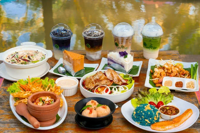 ส่วนอาหารจะเป็นอาหารแบบจานเดียว เมนูแนะนำ ข้าวผัดต้มยำทะเล ข้าวผัดเอาไปผัดเครื่องต้มยำทะเล ตามด้วยกุ้ง ปลาหมึก ตัวโต บอกเลยว่าอร่อย เผ็ด เปรี้ยวแซ่บกำลังพอดี แต่ถ้าไม่อยากกินเผ็ด ข้าวผัดดอกอัญชันก็ตอบโจทย์ ข้าวหอมมะลิหุงด้วยน้ำอัญชัน เอามาผัดกับไข่ให้สุก กินคู่กับหมูทอด จบเลย