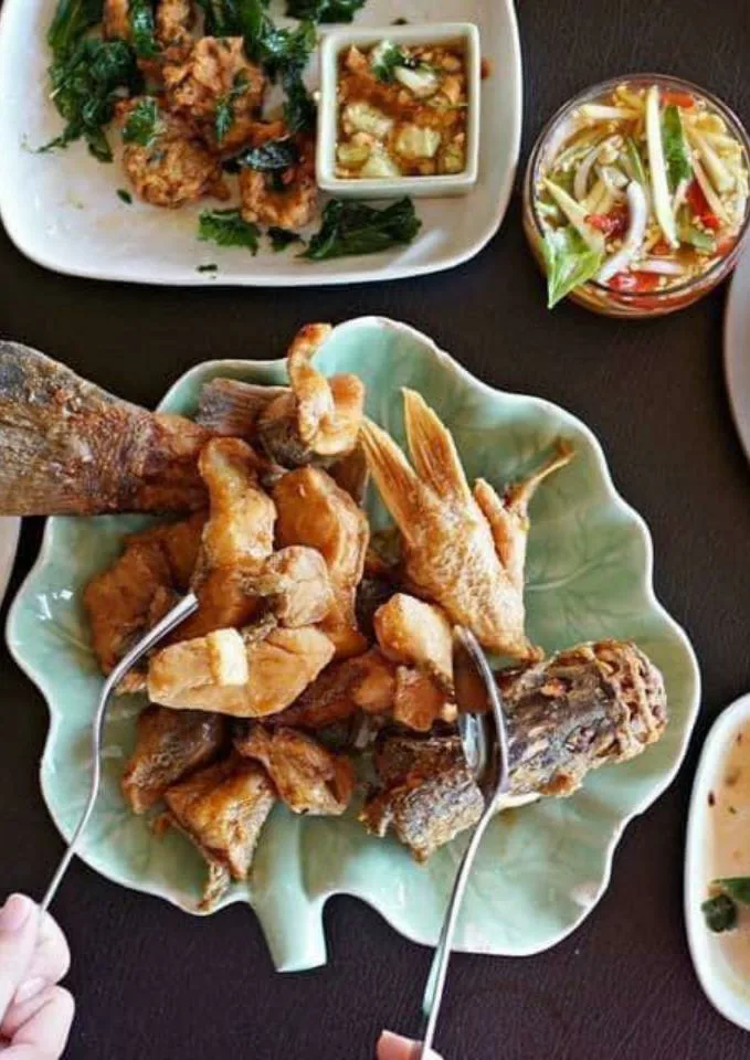 ทางด้านอาหารและเครื่องดื่มของ คาเฟ่ River hut restaurant จะเน้นไปที่อาหารที่เป็นกับข้าวมากกว่า ซึ่งอาหารประเภทปลาร้านนี้ถือว่าทำได้ดีเลย อาจจะมาจากแม่ครัวฝีมือหาตัวจับยากก็เป็นได้ เมนูแรกที่ต้องจัดเป็นปลากะพงทอดน้ำปลา ร้านนี้จะเสิร์ฟมาด้วยปลากะพงเป็นชิ้นทอดให้เหลืองกรอบ ตรงนี้ปลาสดมาก และทอดปลาออกมาได้ดีกรอบ สด น่ากินมากจะกินเล่นหรือกินเป็นกับข้าวก็ได้ น้ำปลาที่ราด กับ น้ำยำมะม่วง ก็ทำได้รสชาติดี ถือว่าสั่งแล้วไม่ผิดหวัง เมนูตอไปปลาคังผัดฉ่า ปลาคังที่สดขึ้นมาจากแม่น้ำ เอามาผัดกับเครื่องเทศรสชาติร้อนแรงที่ต้องบอกเลยว่าเผ็ดร้อน แต่อร่อยดี กินคู่กับข้าวสวยร้อนๆ จะพอดีเหมือนกัน สามไก่ผัดเม็ดมะม่วง ไก่ชิ้นโตที่ผัดให้กรอบ สุก แต่ไม่แข็ง จากนั้นเอาไปคลุกกับเครื่องเทศ เม็ดมะม่วง ทำให้กลายเป็นอีกหนึ่งเมนูที่จะสั่งมากินเป็นกับแกล้มก็โอเค พอเค็มๆ หวานๆ ตามรสชาติดั้งเดิม  เมนูอีกหนึ่งอย่างเอาใจให้เด็กๆ กันหน่อยกับ กุ้งชุบแป้งทอด ที่ทอดมาได้เหลืองดี เนื้อกุ้งเด้งไปมาในปาก กินแล้วเคี้ยวกรุบกริบดี กินสนุก เด็กๆ ชอบใจแน่นอน