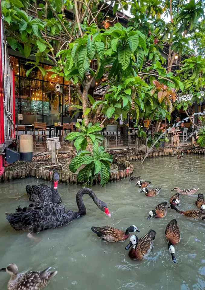บริเวณรอบร้านจะเป็นพื้นสนามหญ้า ข้างๆ จะโอบล้อมด้วยต้นมะพร้าวหลายต้น ส่วนหน้าร้านจะมีบ่อน้ำขนาดใหญ่ ที่พิเศษไปกว่านั้นคือมีสะพานไม้สีแดงขนาดยาวเชื่อมไปยังสวนเมล่อนที่อยู่กลางบ่อ (เรียกได้ว่าไม่ธรรมดาเลยสำหรับร้านนี้) นอกจากนี้แล้วในบ่อน้ำยังมีหงส์ดำจำนวนหนึ่งว่ายไปมา ซึ่งเป็นอะไรที่น่ารักมากทีเดียว แต่นอกจากหงส์ดำแล้วทางร้านก็ยังมีสัตว์ชนิดต่างๆ มากมายให้ลูกค้าได้ชื่นชมความน่ารักของเจ้าทั้งหลาย ร้านจะมีทั้งโซน Indoor ที่อยู่ด้านในร้าน แต่สามารถชมวิวข้างนอกได้เหมือนกัน เพราะหน้าต่างและประตูร้านทำด้วยกระจกใสทั้งหมด ส่วนใครที่อยากดื่มด่ำกับบรรยากาศริมบ่อน้ำแบบชิลล์ๆ สบายๆ ก็ขอแนะนำโซน Outdoor เลยครับ