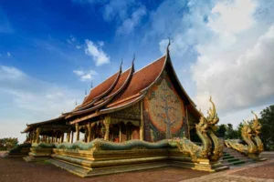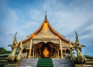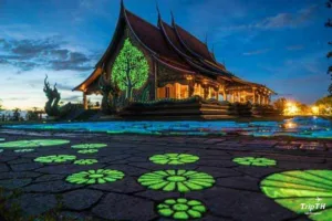 อย่างที่บอกไปว่า วัดนี้เราต้องไปเที่ยวตอนเย็นถึงกลางคืน ถึงจะได้เห็นความสวยงามเรืองแสงที่เป็นจุดเด่นของวัดนี้ (แต่ไปตอนกลางวันก็สวยอยู่นะ ไปเที่ยวได้เหมือนกัน) เราขับรถมาตามเส้นทางจากในเมือง ก็ถือว่าทางดี ขับได้สบาย แต่ว่าในเมืองจะรถติดหน่อยจากชั่วโมงเร่งด่วน พอออกจากตัวจังหวัดได้ก็มายาวๆ เลย ตัวอำเภอไม่ติดเท่าไร พอมาถึงวัดก็เป็นช่วงเย็นแล้ว พอดีเราได้ถ่ายภาพพระอาทิตย์ตกดินได้เลย วิวแม่น้ำโขงที่ตัดกับพระอาทิตย์ ตรงไหนก็สวยๆ จริง ก่อนแสงจะหมดวัน เราเดินชมวัด เห็นความสวยงามของพระอุโบสถแห่งนี้อยู่มากเหมือนกัน ด้านหนึ่งเป็นต้นโพธิ์ใหญ่ มีพญานาคขนาบทางทางขึ้นทั้งสองทาง อีกด้านเป็นทางเข้า โดยอุโบสถหลังนี้สร้างขึ้นจากต้นแบบที่มาจากวัดเชียงทอง ประเทศลาว แต่เราทำใหญ่กว่า ทีนี้เข้าไปด้านใน รับรองว่าสายบุญต้องชอบแน่นอน เพราะว่าจะเป็นพระประธานที่สร้างขึ้นให้คล้ายกับพระพุทธชินราช แต่ไม่มีรัศมีด้านข้าง เป็นอีกหนึ่งองค์ที่สวยมาก บรรยากาศภายในก็เงียบสงบ เหมาะแก่การสักการะมาก