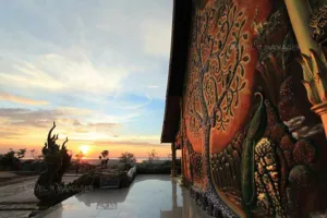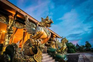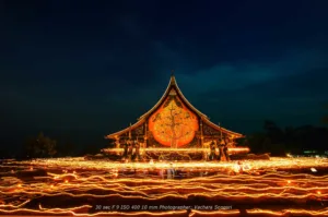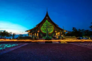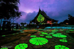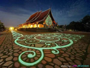 พอออกมาก็ได้เวลาเราไปดูไฮไลต์ของที่นี่กันพอดี นั่นก็คือ วัดเรืองแสง เราไปตามจุดเด่นของที่นี่ก็คือ ต้นโพธิ์ที่เราเล่าไปตอนต้น คนสร้างได้ฉาบสารเรืองแสงลงไปด้วย นั่นทำให้พอแสงหมด ต้นโพธิ์จะกลายเป็นต้นเรืองแสงตรงใบโพธิ์ รวมถึงด้านข้างก็จะมีเรืองแสงด้วย บวกกับด้านหน้าเปิดไฟสีนวลเหลืองทองไปอีก ทำให้วัดนี้ตอนกลางคืนเหมือนกับยกดวงดาวมาไว้ตรงนี้เลย สวยงามมาก ไม่ควรพลาดจริงๆ บอกได้แค่นี้